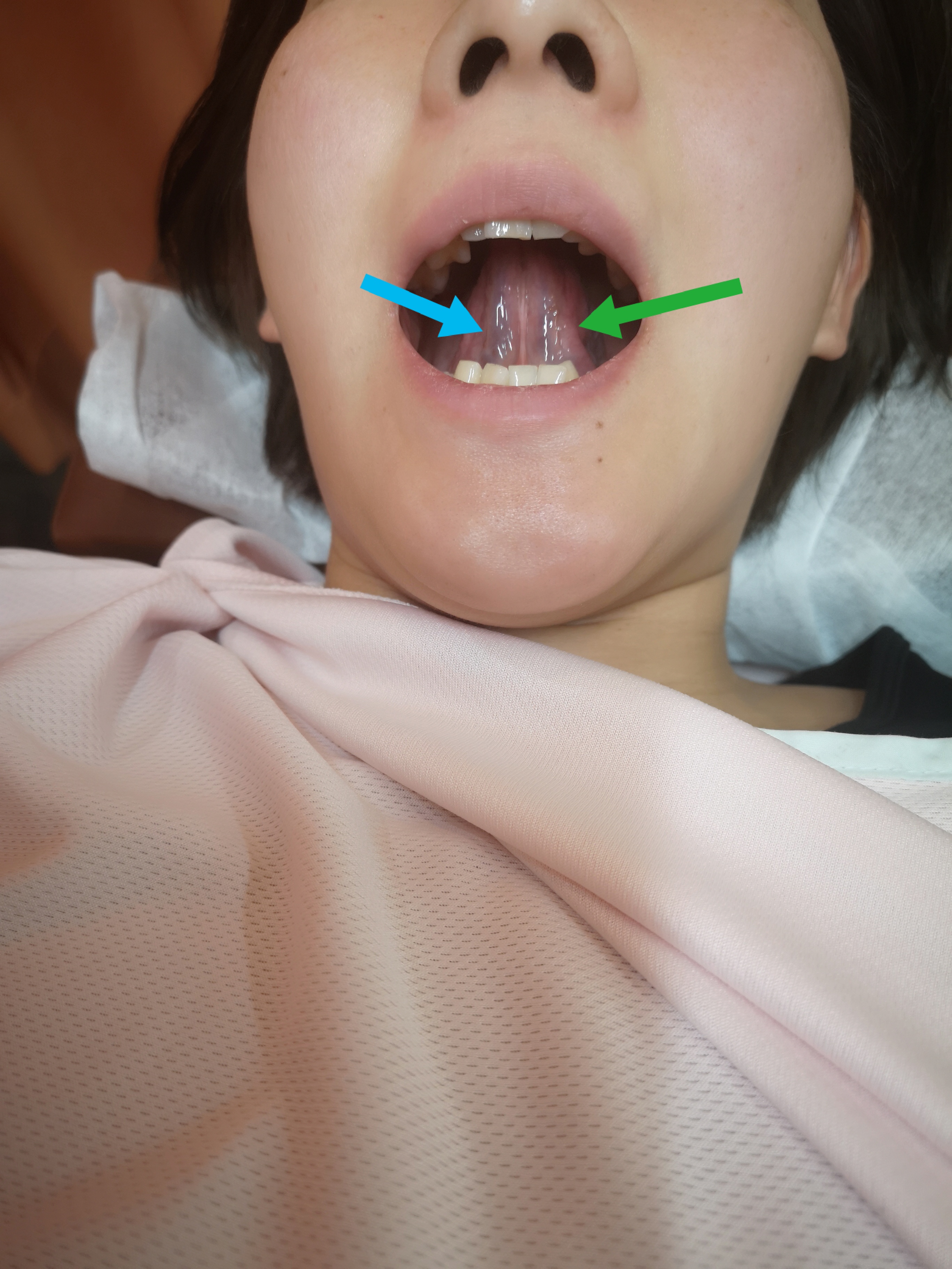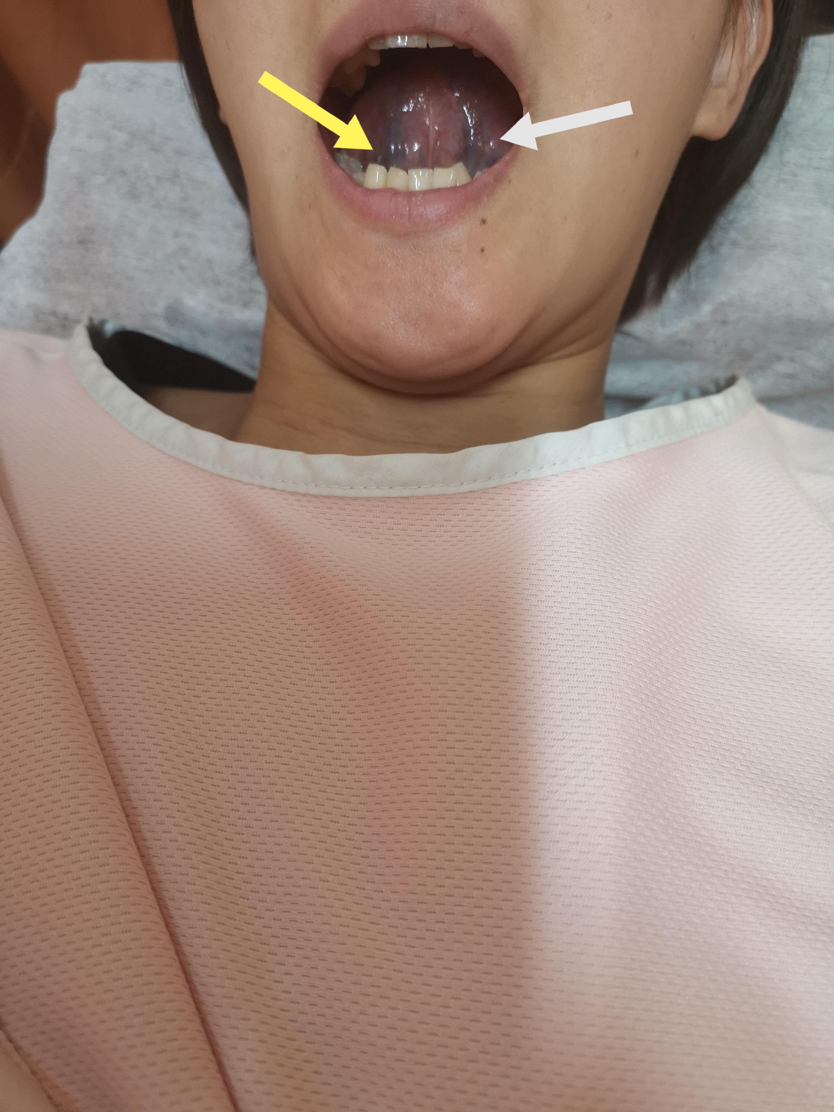 舌下静脈の怒張が左右に著しくありますが、症状のある患者様の右側(黄色矢印)の