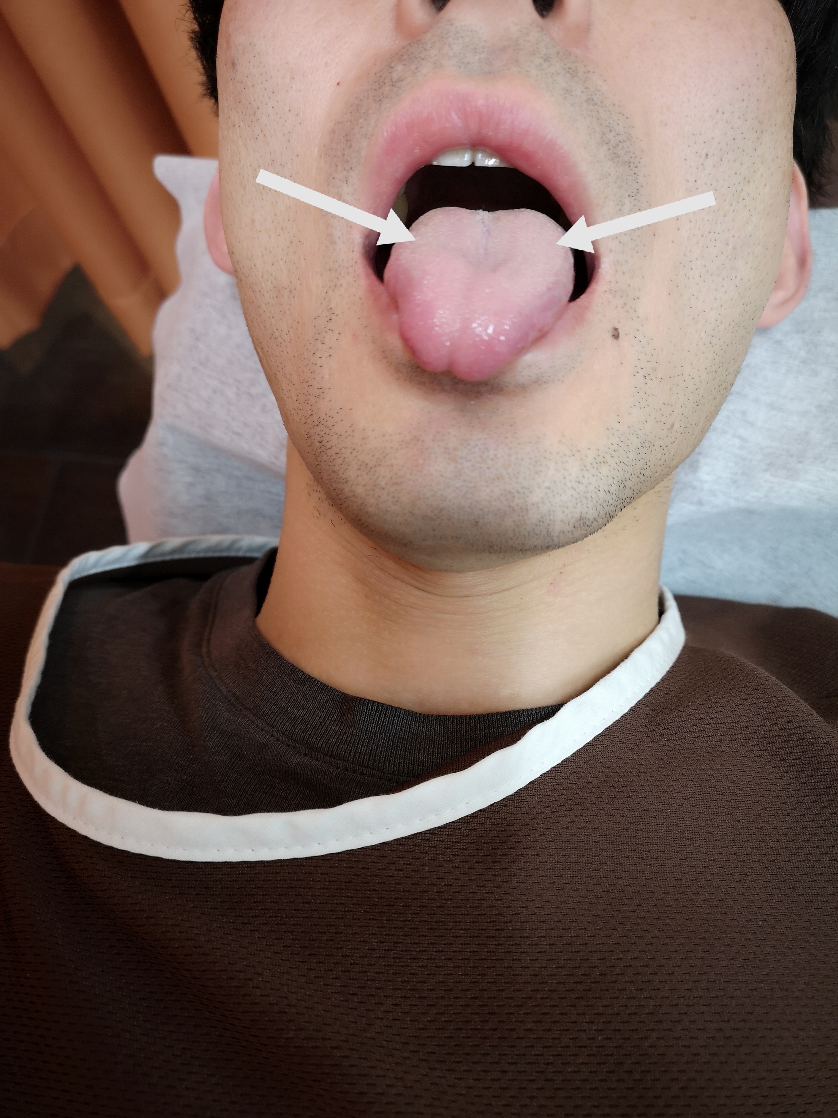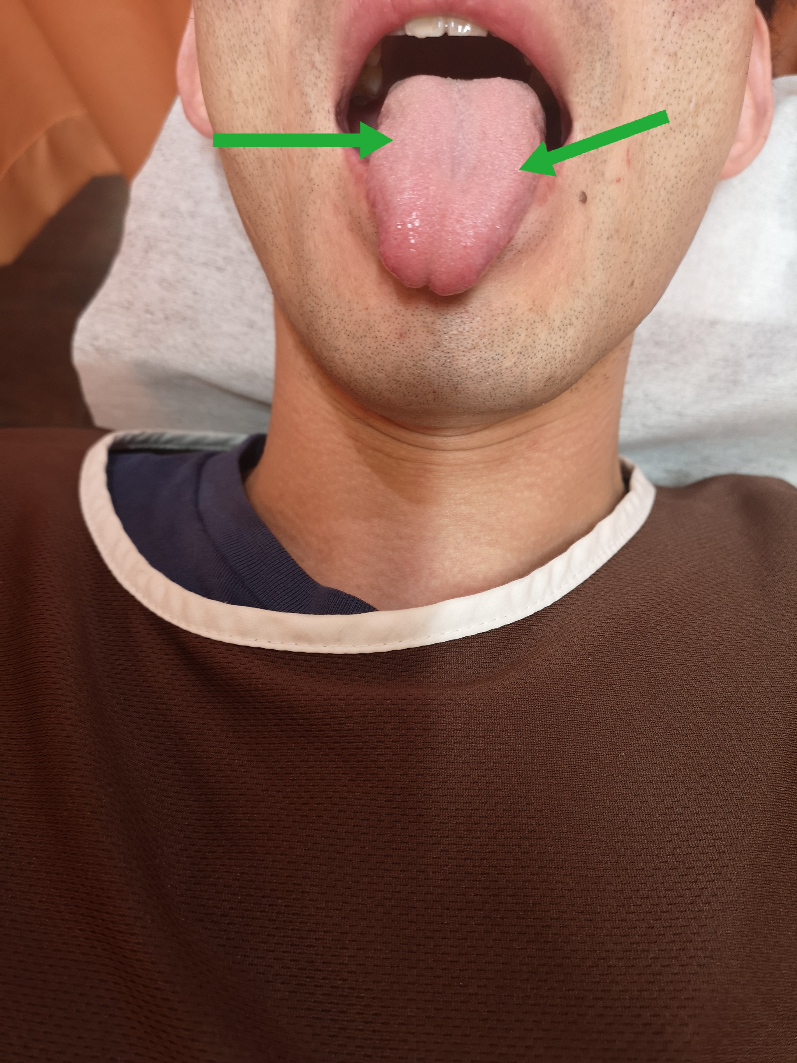 舌全体が白いですね。冷えを意味します。長距離ランナーがが落ち入りやすい状態です。