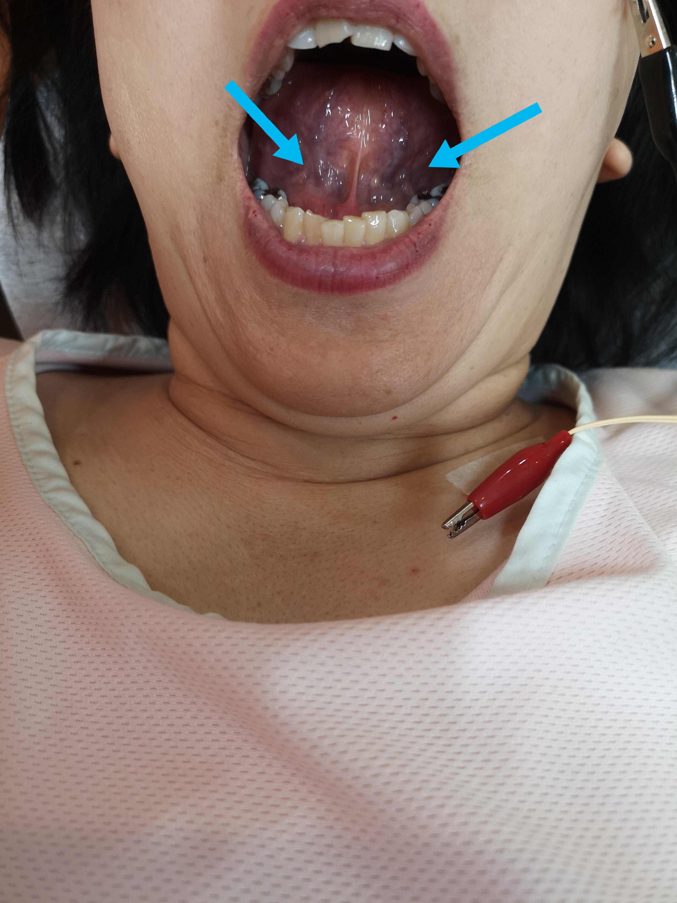 舌下静脈の怒張が著しく色味も黒く瘀血の存在が確認できます。